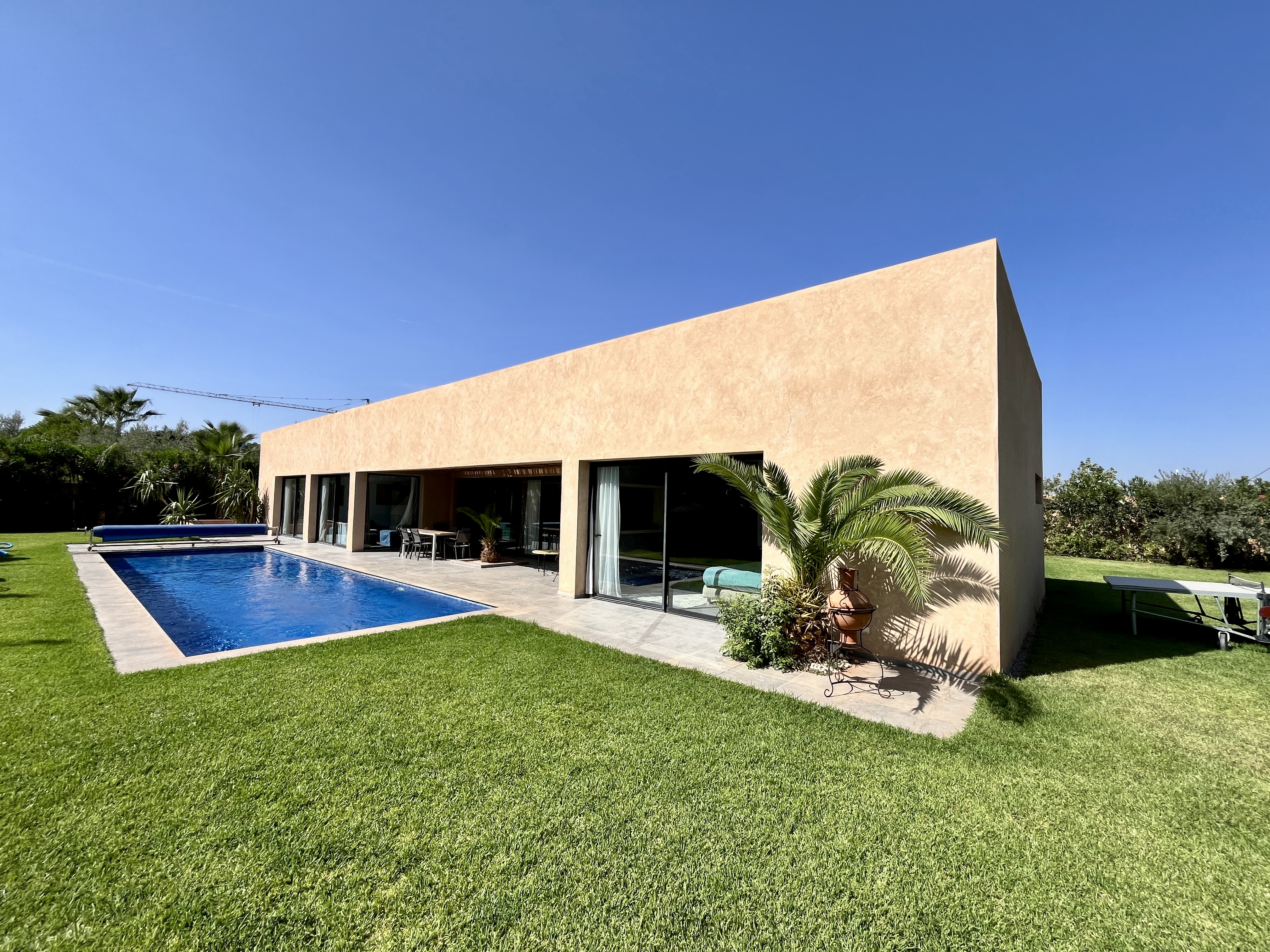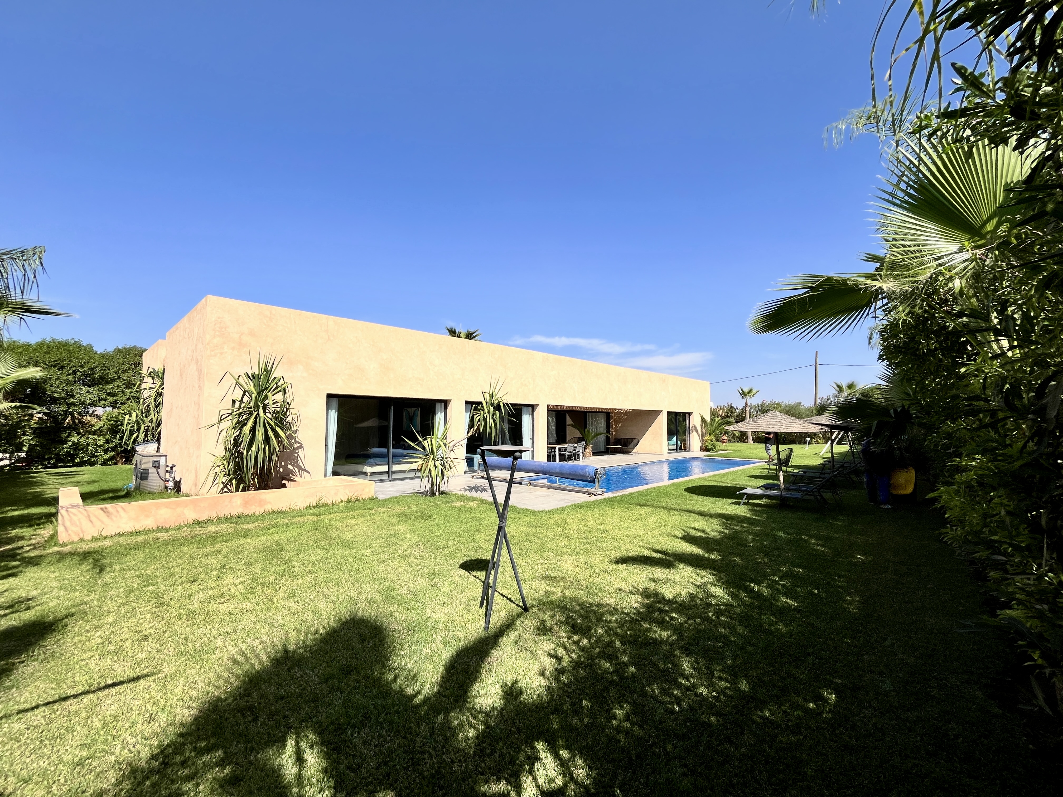 Située sur la route d’Ourika, dans un environnement calme et prestigieux, cette villa contemporaine de plain-pied allie élégance, confort et modernité au cœur d’un cadre verdoyant. Édifiée sur un terrain paysager de 1 350 m², la propriété développe 320 m² habitables savamment agencés autour de la piscine et du jardin arboré. Les espaces de vie — salon, salle à manger et cuisine — s’ouvrent entièrement sur l’extérieur, offrant une luminosité exceptionnelle et une belle continuité entre intérieur et nature. La villa dispose de quatre suites, dont une master, toutes orientées vers la piscine, garantissant intimité et sérénité. La cuisine entièrement équipée répond aux standards les plus exigeants, tandis que la piscine privée chauffée s’intègre harmonieusement à l’ensemble, invitant à la détente tout au long de l’année. Idéalement située dans une résidence sécurisée, la villa bénéficie d’un environnement paisible, à proximité immédiate des golfs les plus réputés de Marrakech. Son entretien irréprochable et sa vue dégagée sur l’Atlas en font une adresse rare, parfaitement adaptée à une clientèle en quête de quiétude et d’élégance. Vous êtes à la recherche d’un bien d’exception à Marrakech ? Si cette villa correspond à vos attentes, nous vous invitons à nous contacter pour en savoir plus. Notre agence, spécialisée dans l’immobilier de prestige, vous accompagne avec discrétion et exigence dans la découverte des plus belles propriétés disponibles sur le marché.
