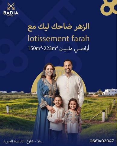Tajziat Farah vous propose des terrains commerciaux de catégorie R3 dans la préfecture d'Al Ayayda à Salé avec des superficies allant de 150 m² à 237 m² Prix très compétitifs à partir de seulement 6200 DH le m². Facilités de paiement et frais fonciers prêts.