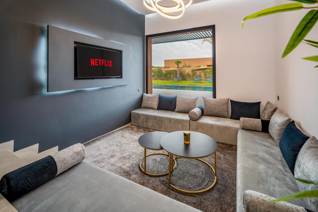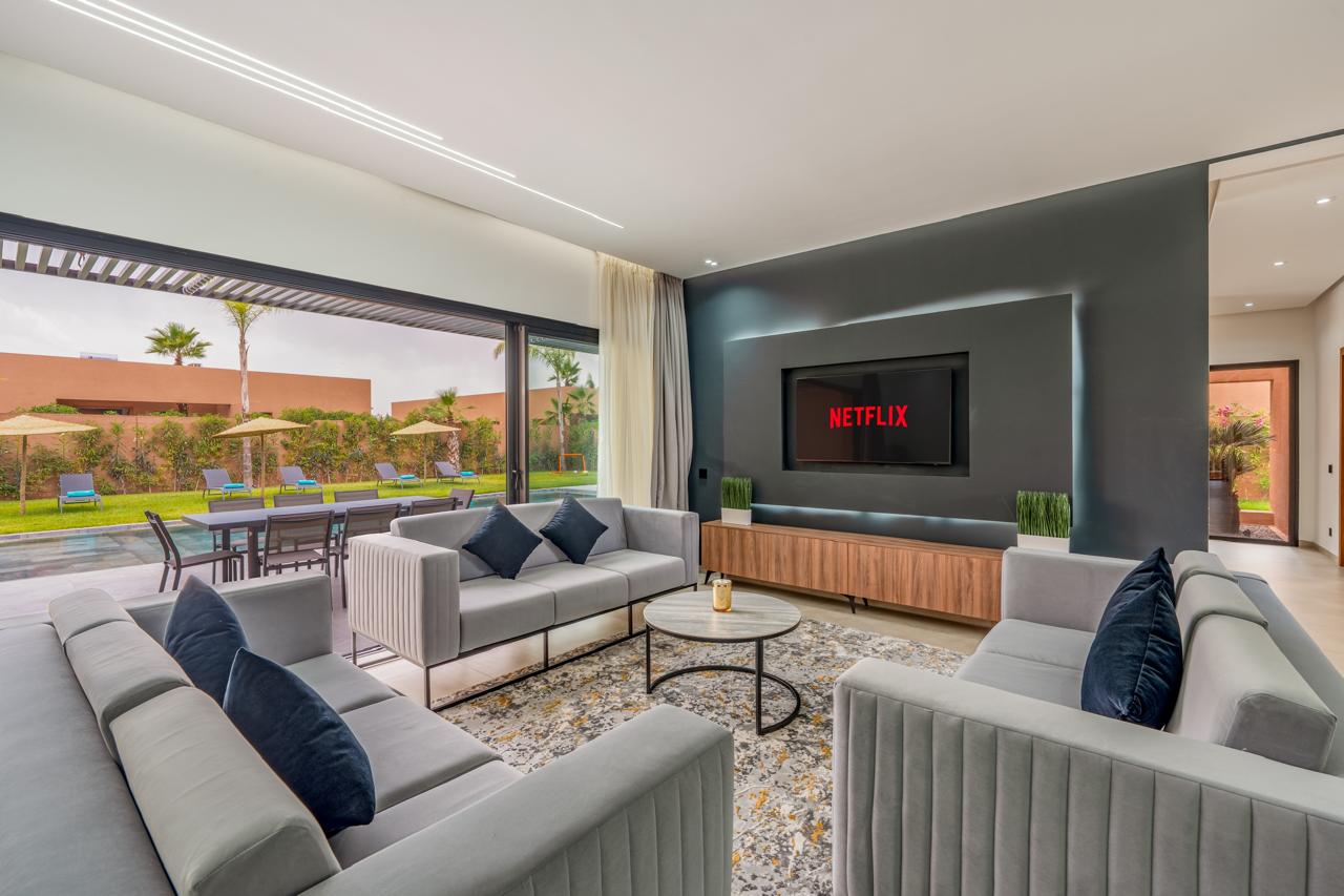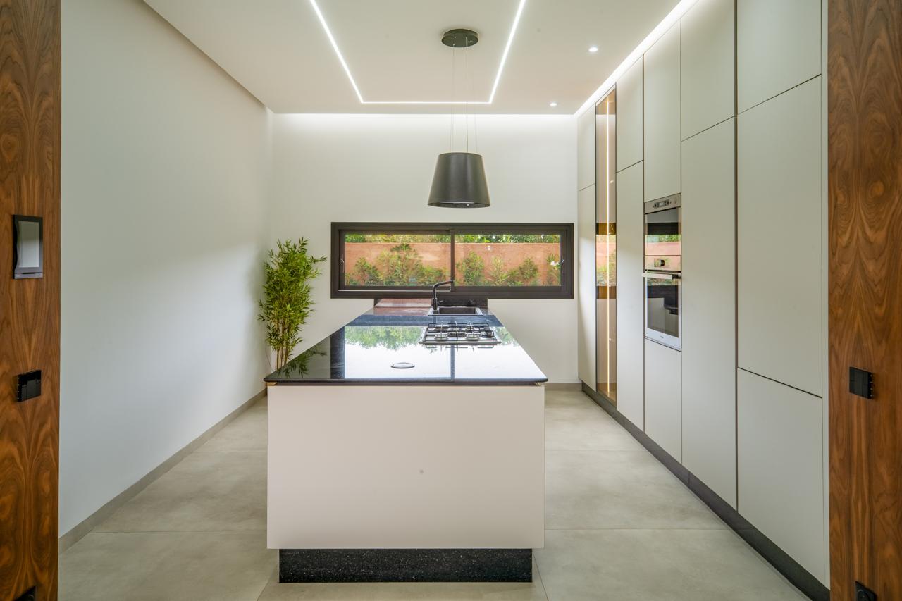 Située sur la route d’Ourika, dans un environnement calme et prestigieux, cette villa contemporaine de plain-pied allie élégance, confort et modernité au cœur d’un cadre verdoyant. Édifiée sur un terrain paysager de 1 350 m², la propriété développe 300 m² habitables savamment agencés autour de la piscine et du jardin arboré. Les espaces de vie — salon, salle à manger et cuisine — s’ouvrent entièrement sur l’extérieur, offrant une luminosité exceptionnelle et une belle continuité entre intérieur et nature. La villa dispose de quatre suites, dont une master, toutes orientées vers la piscine, garantissant intimité et sérénité. La cuisine entièrement équipée répond aux standards les plus exigeants, tandis que la piscine privée chauffée s’intègre harmonieusement à l’ensemble, invitant à la détente tout au long de l’année. Idéalement située dans une résidence sécurisée, la villa bénéficie d’un environnement paisible, à proximité immédiate des golfs les plus réputés de Marrakech. Son entretien irréprochable et sa vue dégagée sur l’Atlas en font une adresse rare, parfaitement adaptée à une clientèle en quête de quiétude et d’élégance. Vous êtes à la recherche d’un bien d’exception à Marrakech ? Si cette villa correspond à vos attentes, nous vous invitons à nous contacter pour en savoir plus. Notre agence, spécialisée dans l’immobilier de prestige, vous accompagne avec discrétion et exigence dans la découverte des plus belles propriétés disponibles sur le marché.